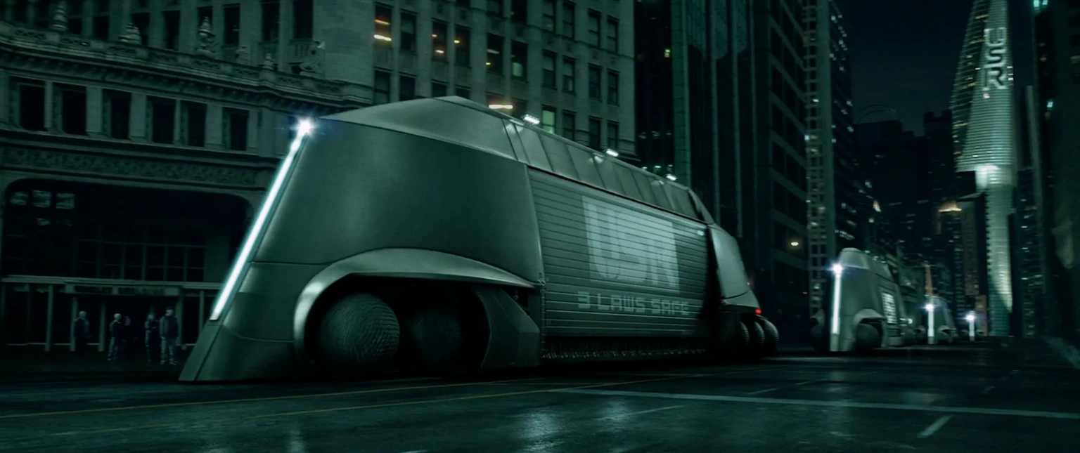 The United States Robotics Robot Transport is a sleek stainless steel automated cargo truck used to transport NS robots around the city. Like all other vehicles in the film, these trucks ride on a set of ten spherical tires, (two on each front and three on each rear). This allows to trucks to parallel park with ease and can even allow it to drive sideways at high speed. The side of the truck houses the storage unit for new and old NS robots. The storage unit has a maximum capacity of one-hundred and fifty robots (with seventy-five per side).